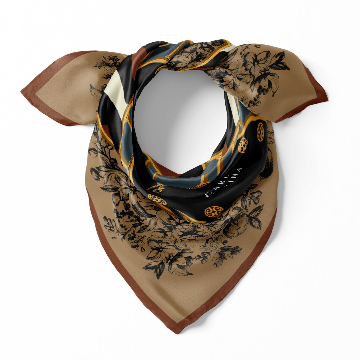 Carlos Ferdinand Fringed Monogram Camel CF900-16 Size: 90cm Fabric: Silk Extra Feature: Fringed Hem