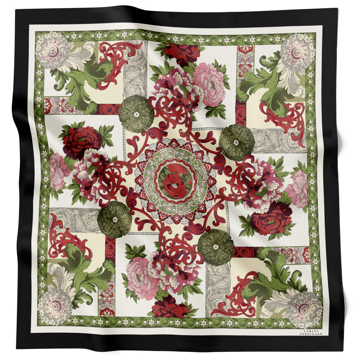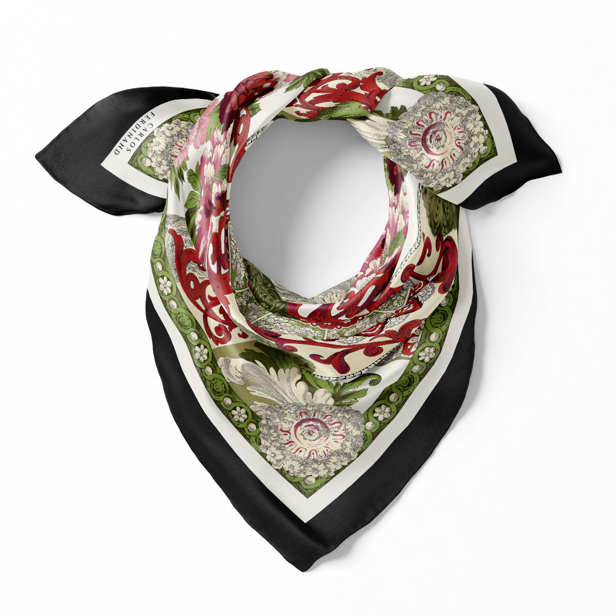 Carlos Ferdinand Fringed Monogram Forest Green CF900-10 Size: 90cm Fabric: Silk Extra Feature: Fringed Hem